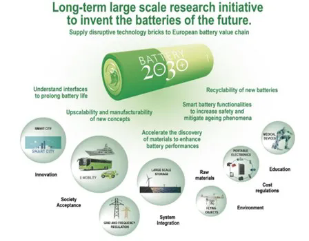 Part I:“電池2030+(BATTERY 2030+)”背景《電池2030+(BATTERY2030+)》是一項大規(guī)模的歐洲長期研究計劃,為歐盟委員會提出的戰(zhàn)略能源技術計劃(SET-plan)的想法之一,旨在聯(lián)合歐洲整體解決未來電池研發(fā)過程中所面臨的各項挑戰(zhàn),克服重重阻力達成宏大的既定的電池性能目標。研究內容以“化學中性途徑(chemistry neutral approach)”為導向,基于現(xiàn)有或未來多種不同類型的電池化學物質,通過縮小各自之間的差距來發(fā)揮其全部潛力以實現(xiàn)電池的實際能力和理論極限。理念上基于給歐洲電池企業(yè)乃至全球電池企業(yè)的價值鏈提供新的發(fā)展和支持,比如從原材料到先進材料的發(fā)展,到電池和電池包的設計制造,電池壽命終止后的回收利用和電池實際應用場景等。除此之外,《電池2030+》的長期發(fā)展路線圖也充分地彌補了歐洲電池內部的中期研究和創(chuàng)新工作–歐洲技術和創(chuàng)新平臺(ETIP)。因此,歐盟希望借助于《電池2030+》來推動歐洲為期10年的大規(guī)模努力以促進電池領域的變革性發(fā)展。不斷提出新的研究方法和開拓新的創(chuàng)新領域,實現(xiàn)安全的超高性能電池開發(fā),最終實現(xiàn)歐洲社會2050年前不再使用化石能源(如圖1所示)。2019年3月,歐盟啟動《電池2030+》協(xié)調和支持行動,以確定計劃的研發(fā)路線圖。本次發(fā)布的《電池2030+》研發(fā)路線圖第二版草案經討論修改后,將于2020年2月底提交給歐盟委員會。 圖1. 《電池2030+》的長期愿景及使命 Part II:“電池2030+”計劃目標《電池2030+》的總體目標是實現(xiàn)具有超高性能和智能化的可持續(xù)電池功能以適用于每個應用場景。所謂超高性能,是指能量和功率密度接近理論極限,出色的使用壽命和可靠性,增強安全性,環(huán)境可持續(xù)性和可擴展性,以實現(xiàn)具有競爭力成本的大規(guī)模化生產電池。第一個重要挑戰(zhàn)是達到最 好的電池性能,因此發(fā)現(xiàn)新材料和新化學體系的開發(fā)過程必須加快。《電池2030+》提出電池界面基因組(BIG)–材料加速平臺(MAP)計劃,將采用人工智能(AI)大幅減少電池材料的開發(fā)周期。第二個重要挑戰(zhàn)是延長單體電池和電池系統(tǒng)的使用壽命和安全性。壽命和安全都對未來電池的大小,成本和接受度具有關鍵性影響。為了實現(xiàn)第二個挑戰(zhàn),《電池2030+》提出了兩種不同且互補的建議方案:開發(fā)直接在化學和電化學反應中可探測的傳感器,將新型傳感器嵌入電池中連續(xù)監(jiān)控其“健康”和“安全狀態(tài)”。另一方面,通過使用自愈合功能來提高電池容量并提高電池性能。與目前最 先進的電池技術相比,《電池2030+》旨在提出并影響電池技術的未來發(fā)展(如圖2):第一,將電池實際性能(能量密度和功率密度)和理論性能之間的差距減少至少1/2。第二,至少將電池的耐用性和可靠性提高3倍。第三,對于給定的電力組合,將電池的生命周期碳足跡減少至少1/5。第四,使電池的回收率達到至少75%,并實現(xiàn)關鍵的原材料回收率接近100%。 圖2.《電池2030+》對未來電化學存儲系統(tǒng)的最 新技術展望 Part III:“電池2030+”主要研發(fā)方向3.1 材料加速平臺(Materials Acceleration Platform,MAP)從能源技術的生產,存儲到最終交付使用,材料的發(fā)現(xiàn)和開發(fā)始終貫穿于整個過程。特別對于新興的電池技術,先進材料幾乎是所有清潔能源創(chuàng)新的基礎。若依靠現(xiàn)有的傳統(tǒng)重復性試驗開發(fā)過程,需要耗費大量的時間,人力物力去開發(fā)新型高性能電池材料并用于電池設計,這一過程從最初發(fā)現(xiàn)到完全實現(xiàn)商業(yè)化可能長達10年之久。因此,在《電池2030+》項目中,為了加速超高性能的,可持續(xù)發(fā)展的智能型電池開發(fā),計劃在歐洲范圍內設立電池“材料加速平臺(MAP)”,并與電池界面基因組(BatteryInterface Genome,BIG)集成在一起。同時BIG-MAP基礎設施模塊化設置,全系統(tǒng)具有高度的通用性,以便能夠容納所有新興的電池化學體系,材料成分,結構和界面。另一方面,MAP將利用人工智能(AI)從許多互補的方法和技術中集成和編排數(shù)據(jù),整合計算材料設計,模塊化和自主性綜合機器人技術和先進表征,實現(xiàn)全新的電池開發(fā)策略。促進材料,工藝和設備的逆向設計和定制。最終,在MAP框架下由每個核心元素構建概念電池,開發(fā)出具有突破性的電池材料,極大提高電池開發(fā)速度和電池性能。圖3. 電池材料加速平臺(MAP)的核心組成部分 (一)MAP重點研發(fā)技術a. 高通量技術:開發(fā)自主材料合成機器人,構建電池材料自身及使用過程中原位的自動化高通量表征。實現(xiàn)電極活性材料及其組合方式的快速篩選和電解液配方的系統(tǒng)表征?;诟咄繑?shù)據(jù)的建模和數(shù)據(jù)生成相結合,以物理參數(shù)為導向對電池及其活性材料進行分析和表征。b. 建立基于分布式訪問模型的跨區(qū)域通用數(shù)據(jù)基礎架構,實現(xiàn)多維度互連和集成工作流程:確保在材料的閉環(huán)研發(fā)過程中,能夠實時進行跨區(qū)域的實驗數(shù)據(jù)集成和建模。通過數(shù)據(jù)的共享實現(xiàn)信息的匯總及規(guī)?;治?。以機器學習和物理理論為導向的數(shù)據(jù)驅動模型去識別材料開發(fā)過程中重要的參數(shù)和特征,開